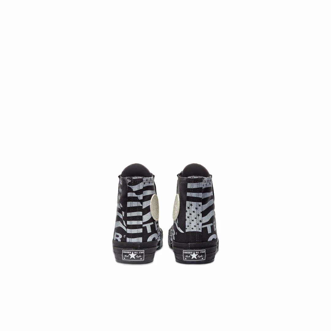 Announcing our upcoming 2021 footwear collaboration with Converse, Telfar wraps the classic Chuck 70 in a printed T-shirt. Featuring all-over printed raw-edge jersey construction from the laces to the outsole, and a custom distressed rubber all-star patch on shaft.