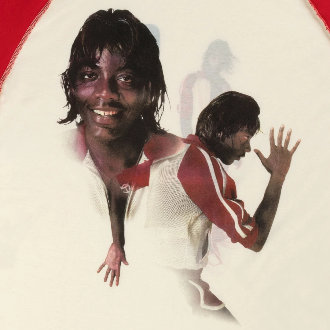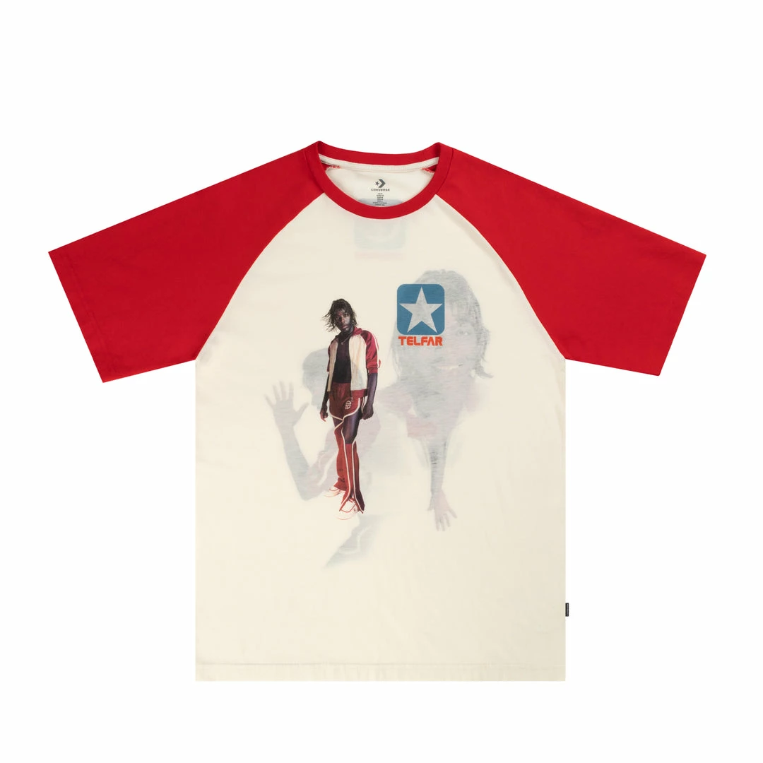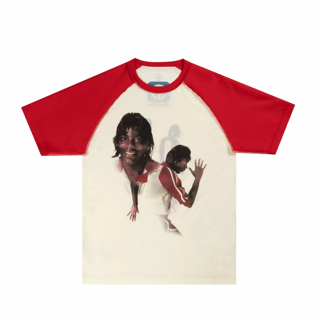 To announce our upcoming 2021 collaboration with Converse, this reversible white raglan T shirt in red and white casts artist Johan Galaxy as a track and field heartthrob. Made in super-soft jersey with collaboration logo on back neck.