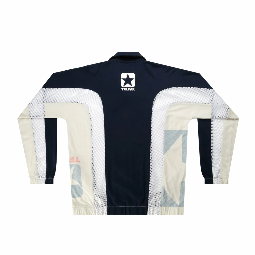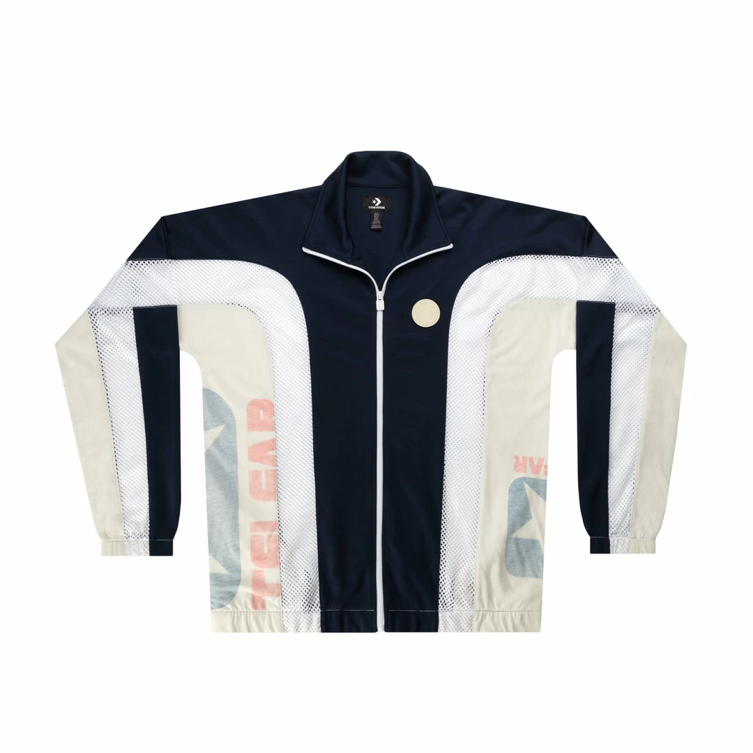 To announce our upcoming 2021 collaboration with Converse, this mod track jacket features curving cut-out panels in compression, mesh and printed T shirt; a custom logo zipper pull and distressed rubber patch on chest.