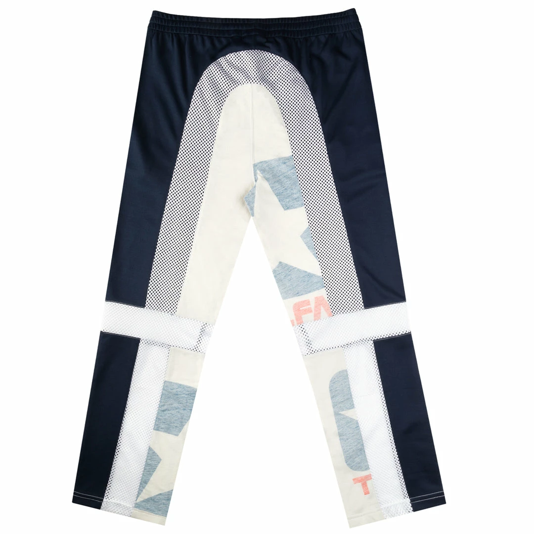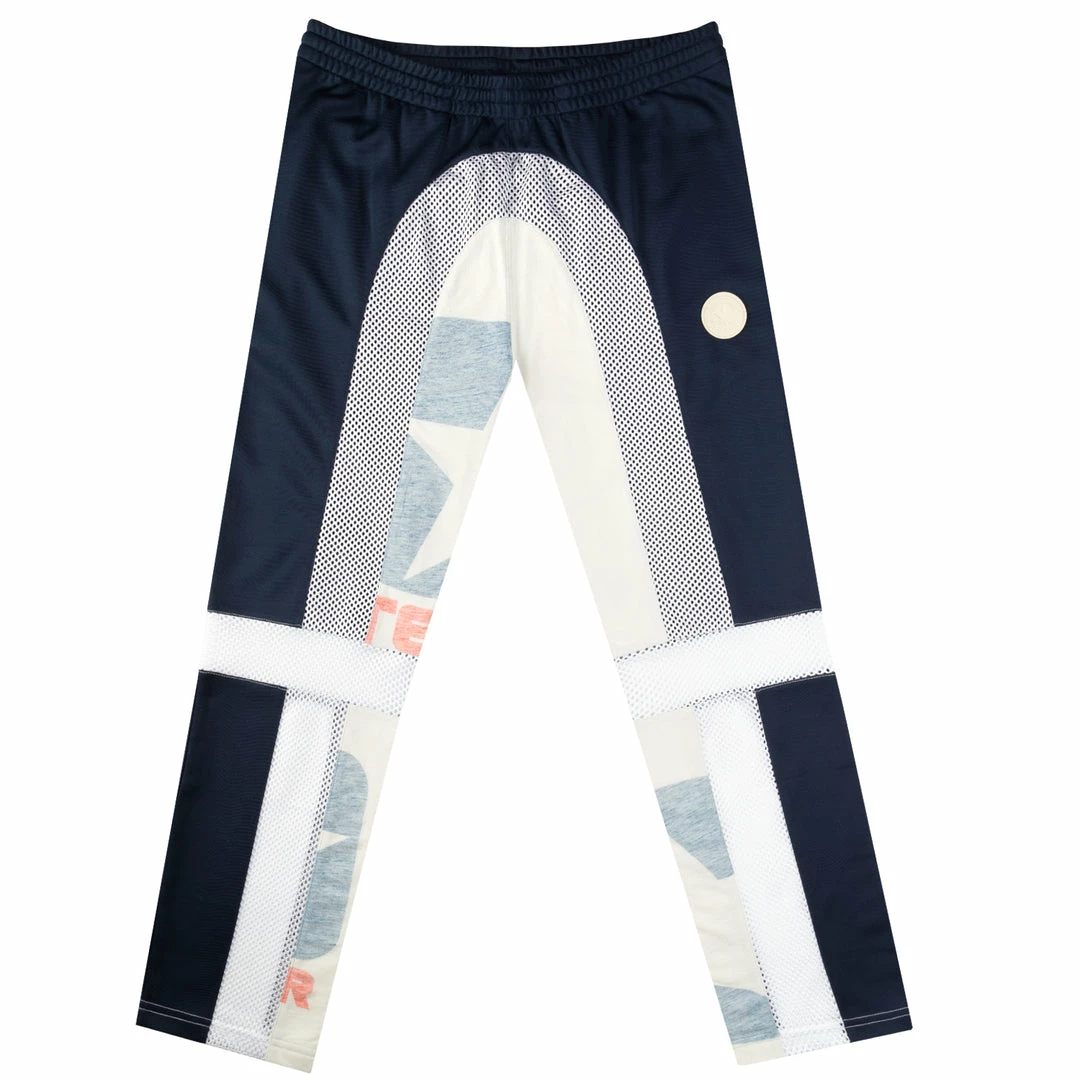 To announce our upcoming 2021 collaboration with Converse, this mod, white and navy track pant features curving cut-out panels in compression, mesh and printed T shirt; a custom logo zipper pull and distressed rubber patch on chest.