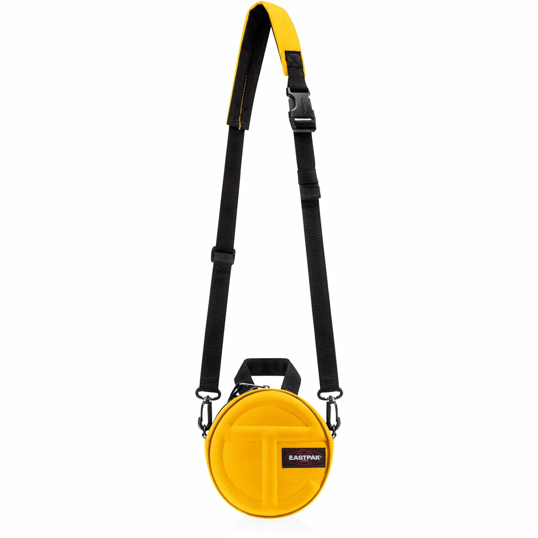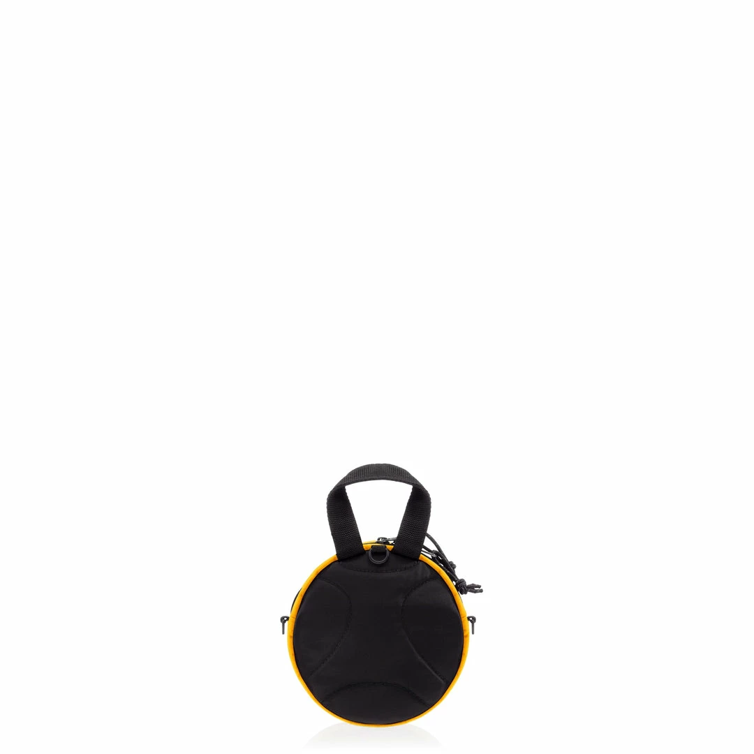 Telfar Circle Bag in tactical canvas with woven hand straps and removable/adjustable padded shoulder strap to be worn crossbody, around the waist or over the shoulder. Exterior features embossed Telfar logo and interior includes zipper pockets and mesh inner compartments.