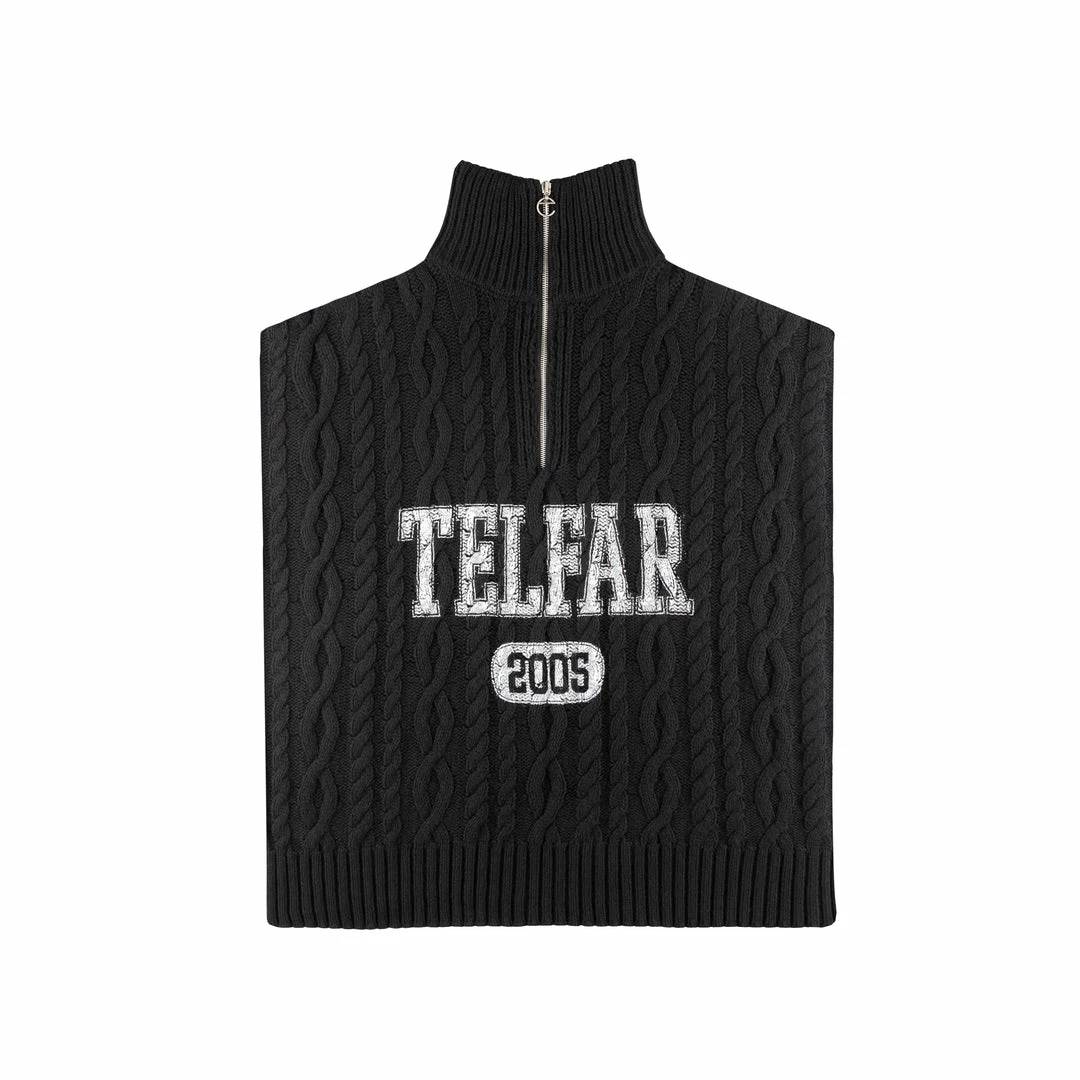 Our iconic sideless sweatshirt is re-made as a fully-fashioned knit sweater. Featuring a chunky all-over cable pattern, extra-tall ribbed collar with logo zipper opening and our signature collegiate screen print in front. Made from soft wool-cashmere blend yarn to keep you warm and cozy.