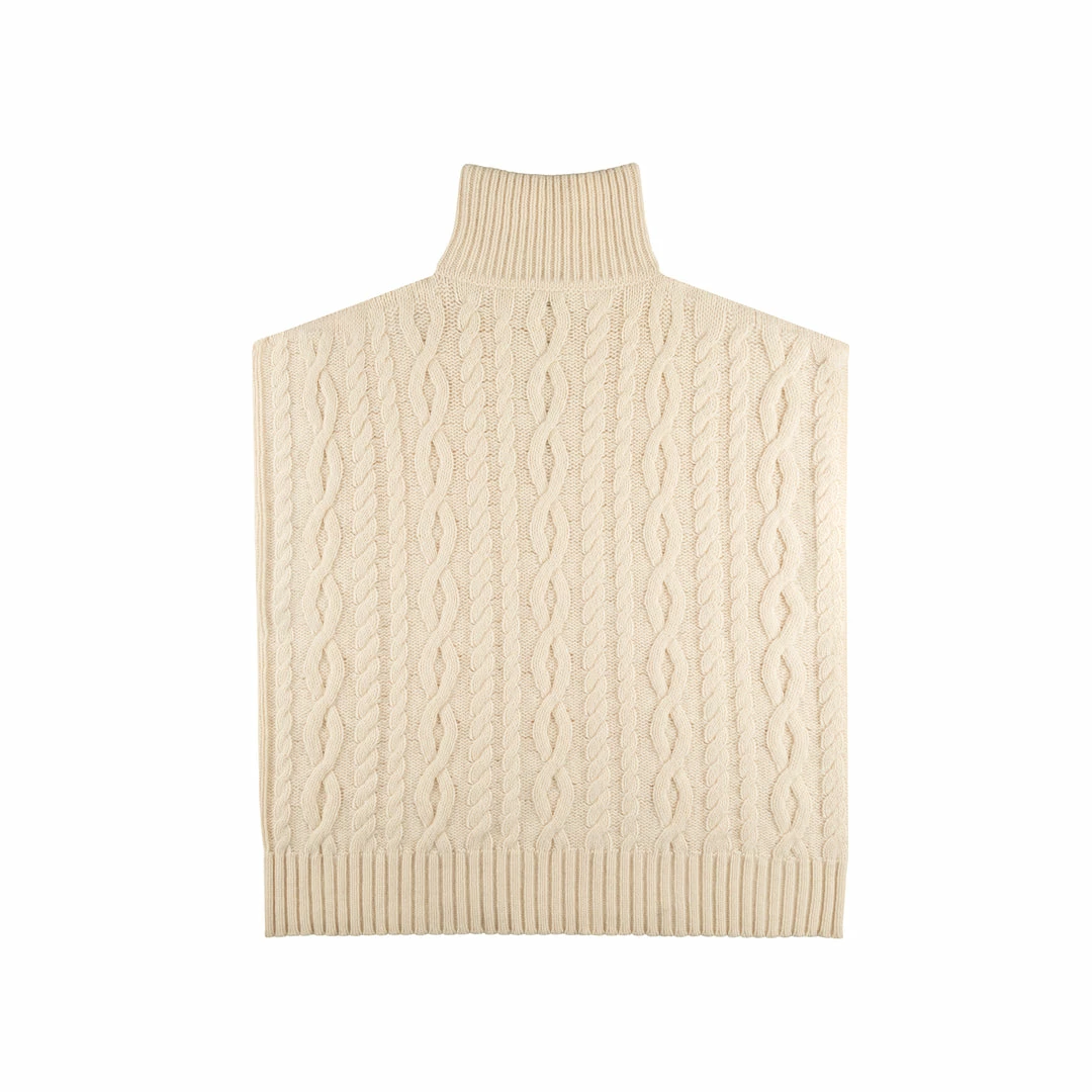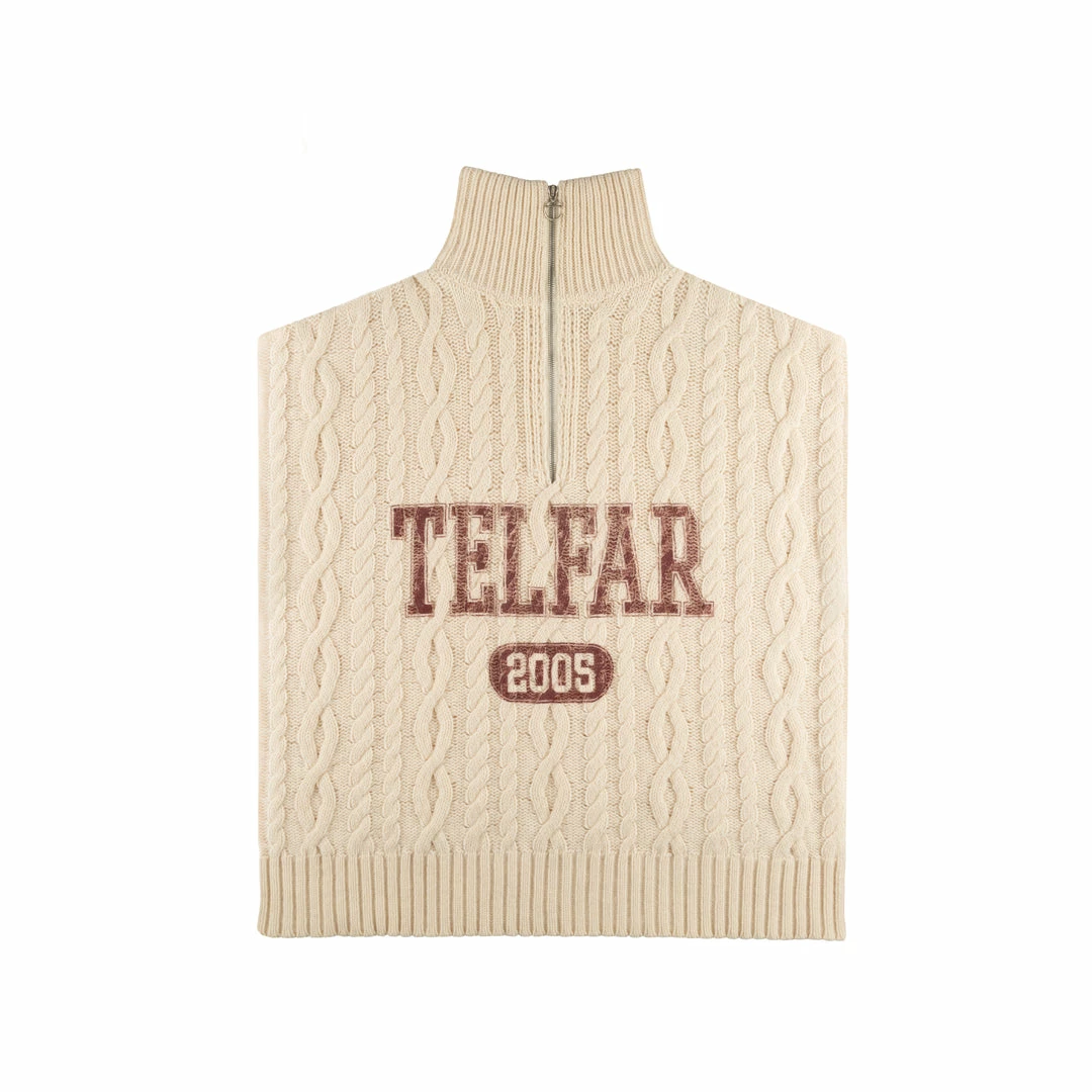 Our iconic sideless sweatshirt is re-made as a fully-fashioned knit sweater. Featuring a chunky all-over cable pattern, extra-tall ribbed collar with logo zipper opening and our signature collegiate screen print in front. Made from soft wool-cashmere blend yarn to keep you warm and cozy.