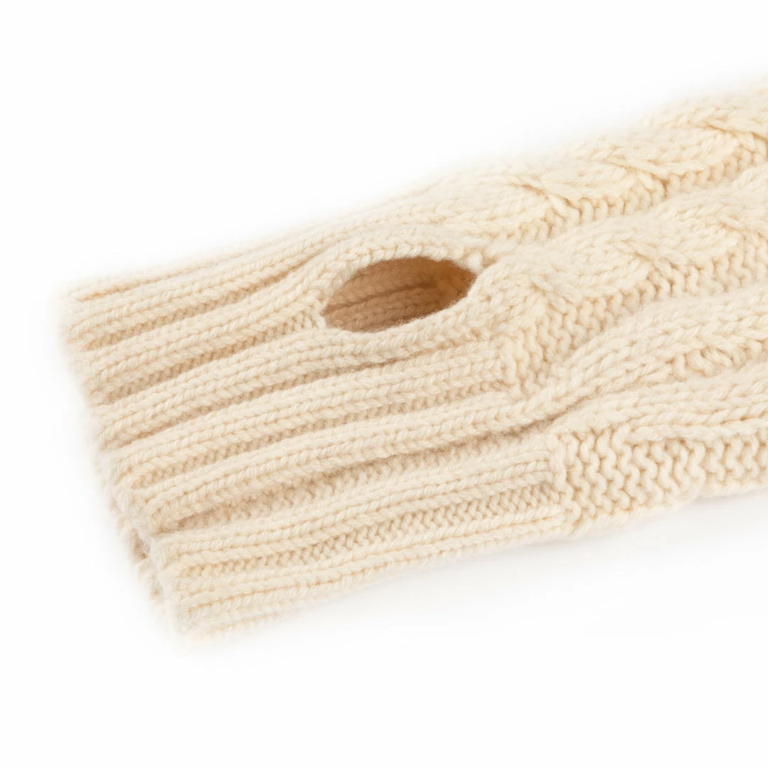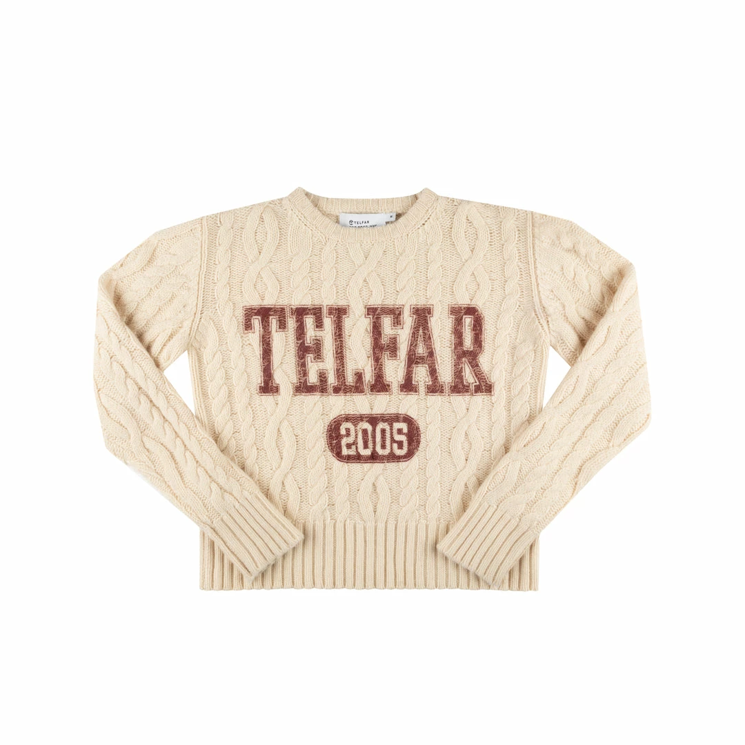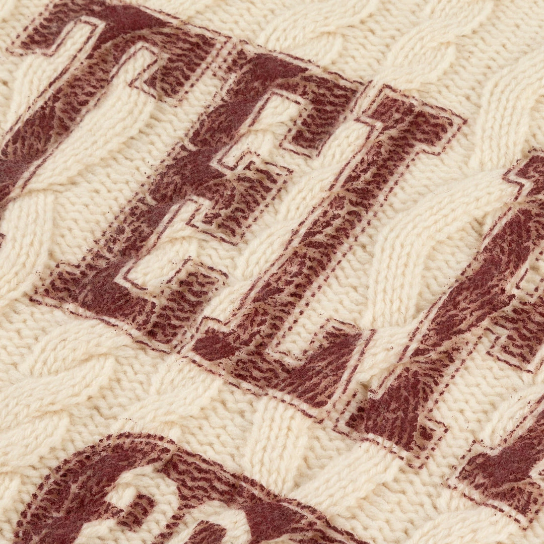 Our iconic pull-over is re-made as a fully-fashioned knit sweater. Featuring a cropped length, chunky all-over cable pattern, extra-tall ribbed cuff with thumbhole to keep your hands warm and our signature collegiate screen print in front. Made from soft wool-cashmere blend yarn to keep you warm and cozy.
