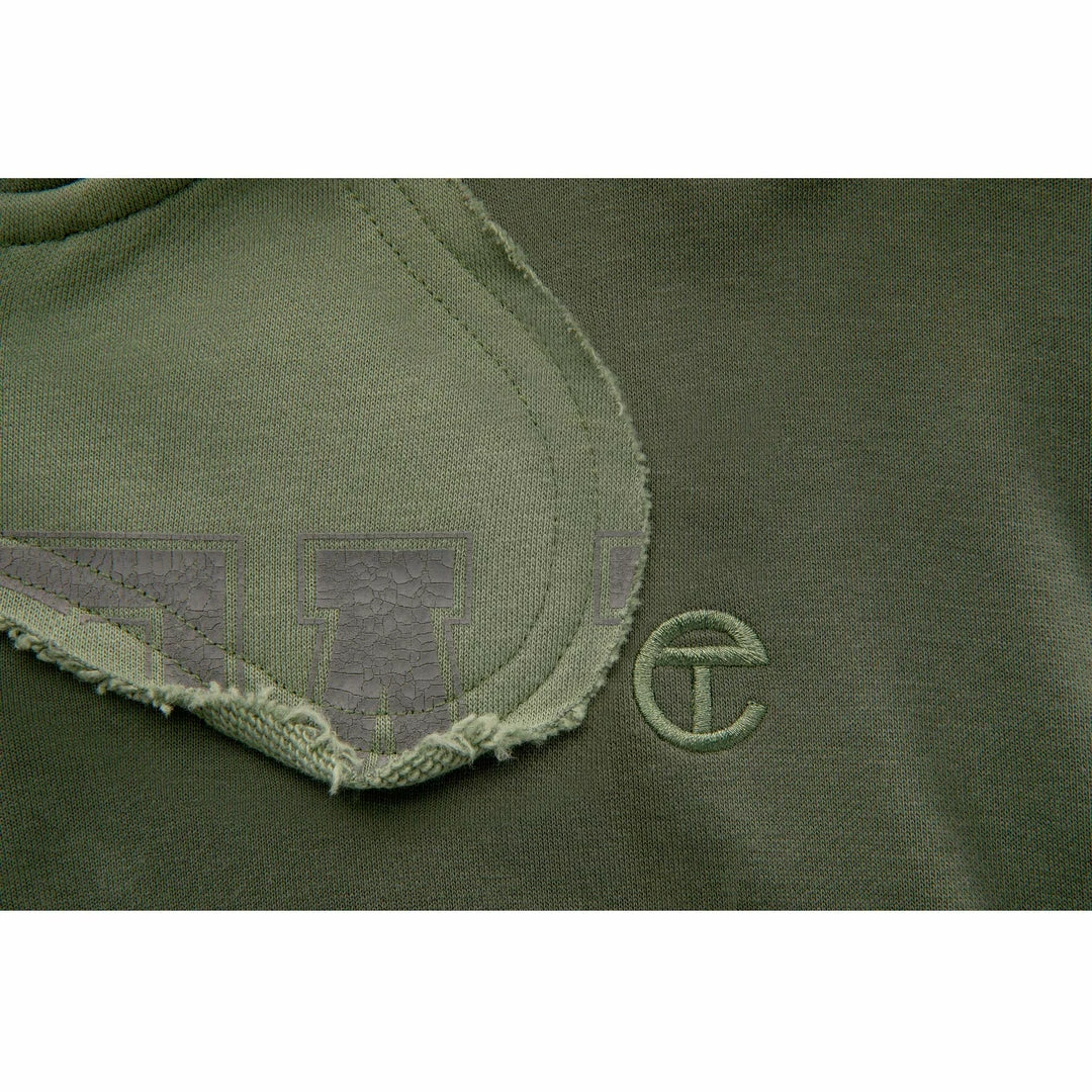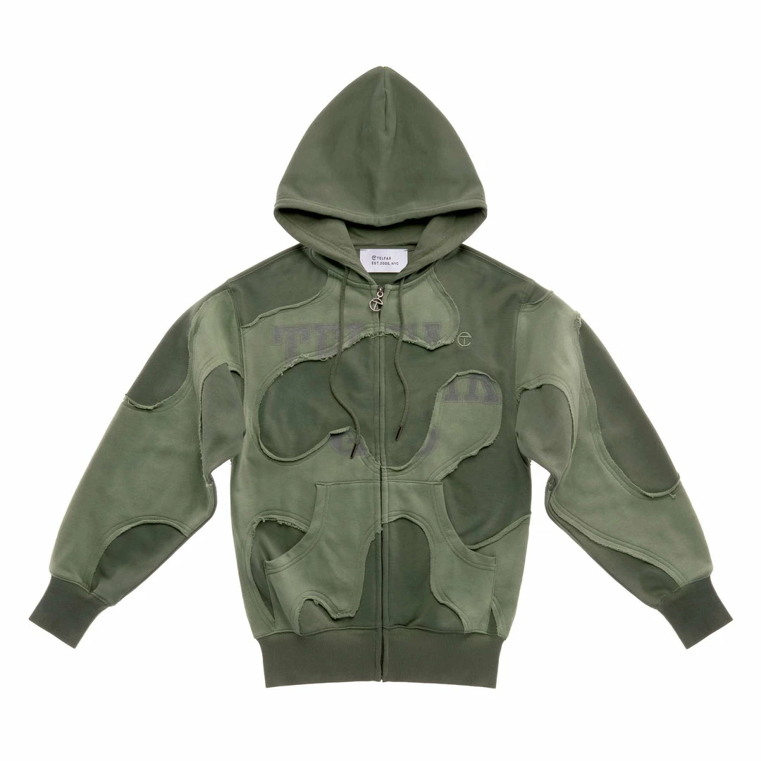 Boxy Camo Hoodie constructed by layering two tones ofΒ terry-back fleece in a camouflage pattern. Featuring TELFAR print in cracked ink on chest β obscured by raw edged camo cut-outs.