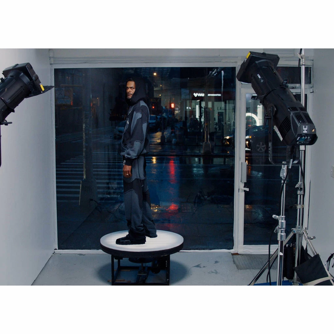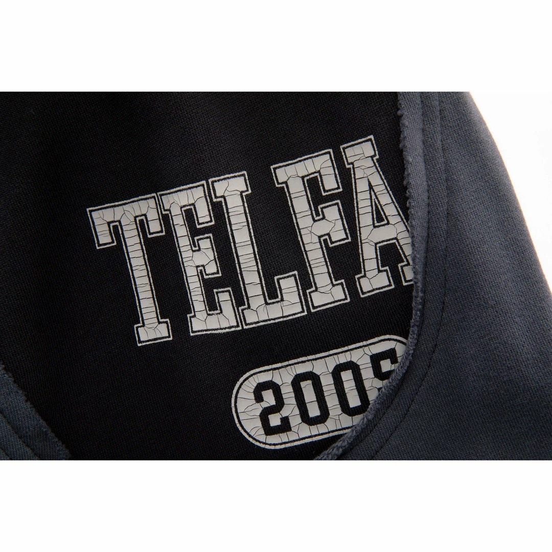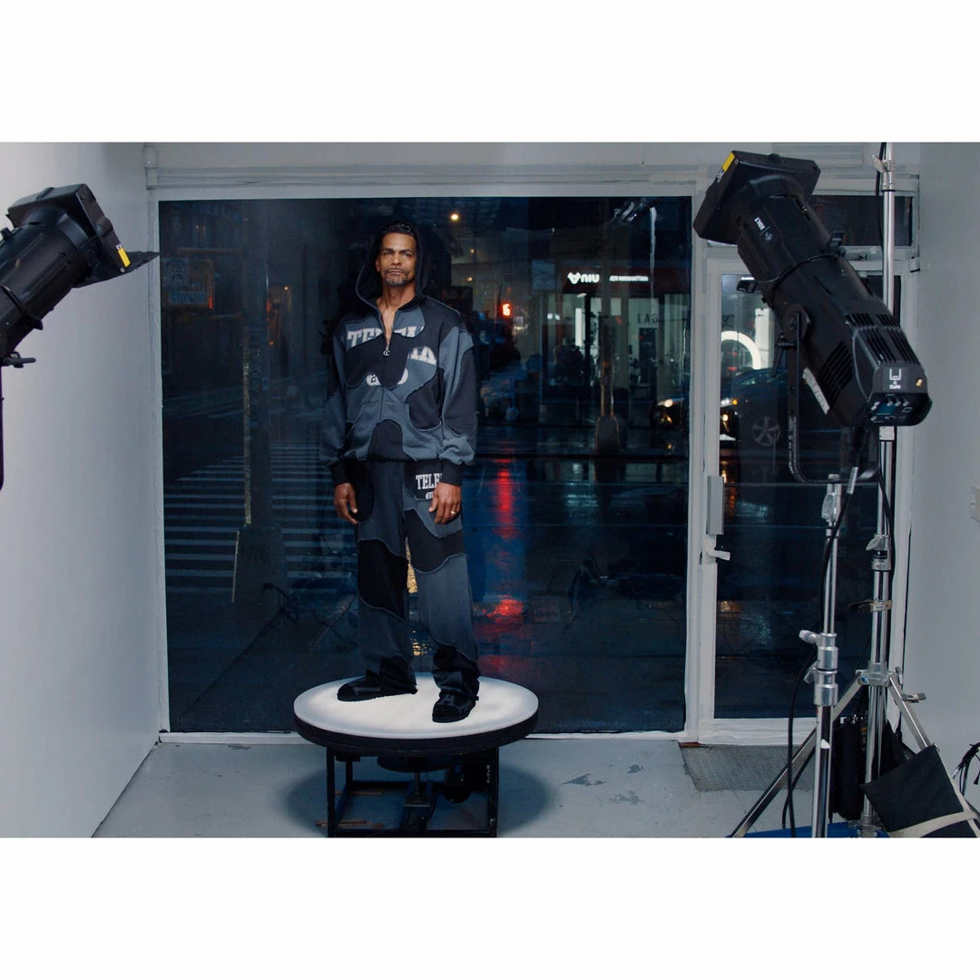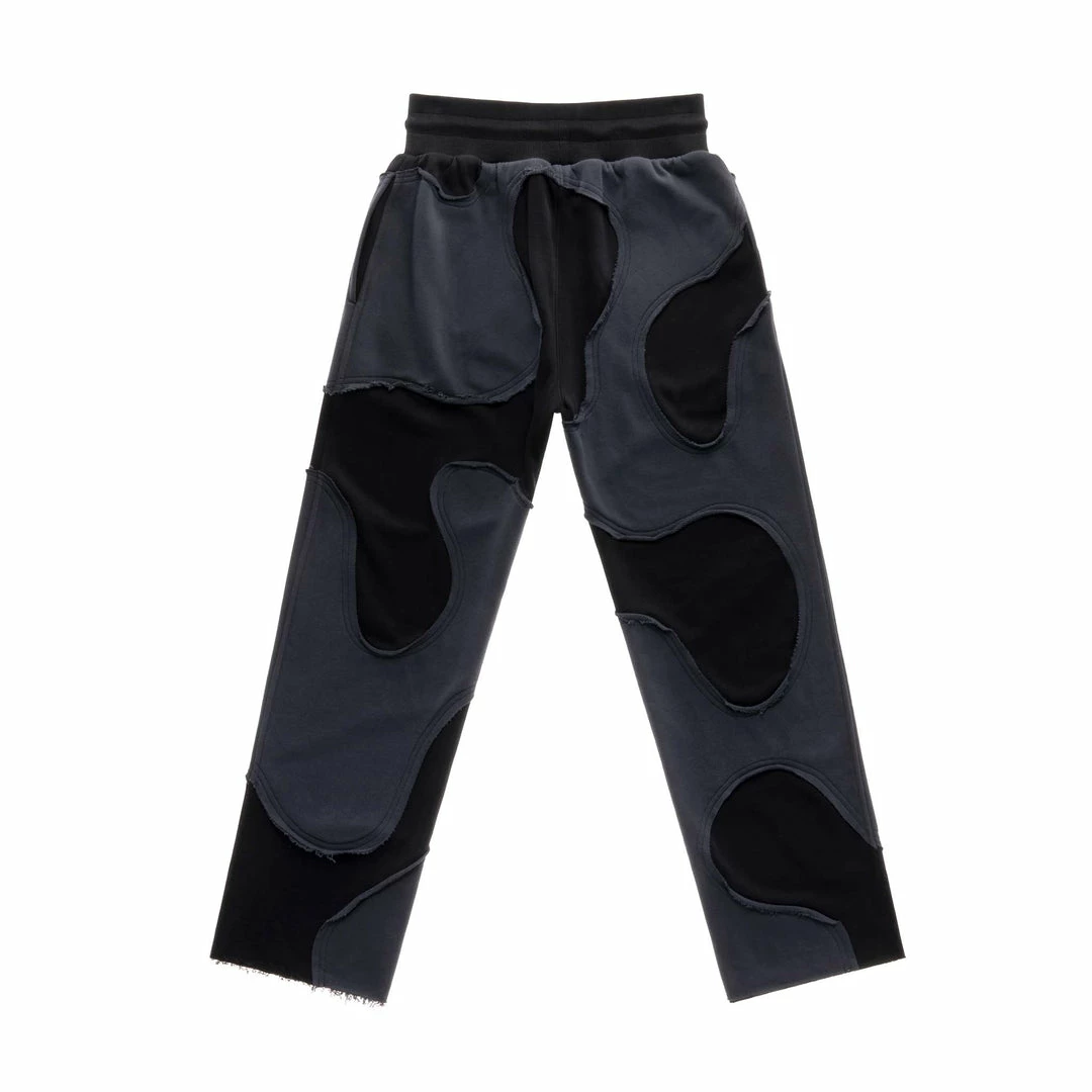 Camo-sweatpant constructed by layering two tones of heather sweatshirt fabric in a camouflage pattern. This cut-off sweatpant features a mid-thigh length, elasticated drawstring waistband, our cracked-ink TELFAR print on left thigh โ obscured by raw edged camo cut-outs.