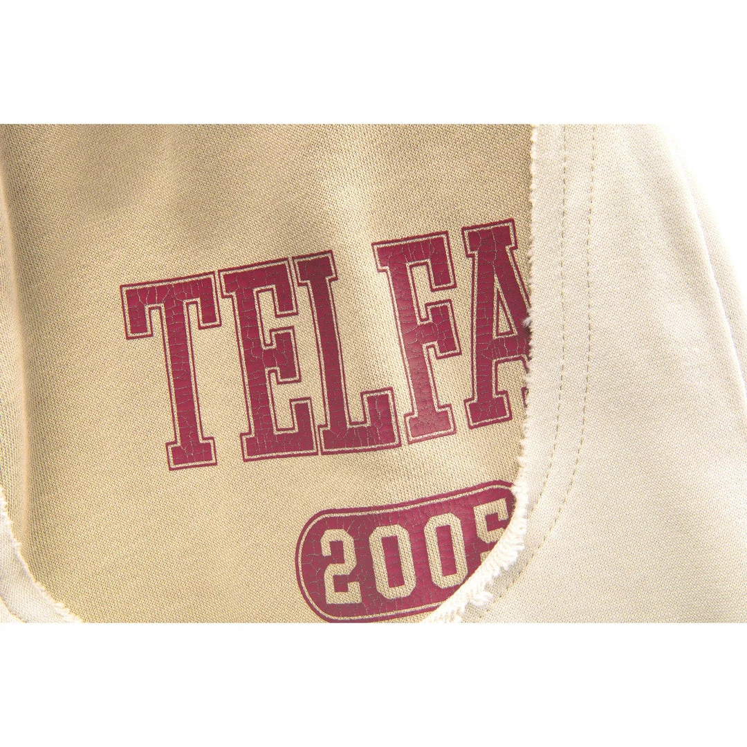 Camo-sweatpant constructed by layering two tones of heather sweatshirt fabric in a camouflage pattern. This cut-off sweatpant features a mid-thigh length, elasticated drawstring waistband, our cracked-ink TELFAR print on left thigh โ obscured by raw edged camo cut-outs.