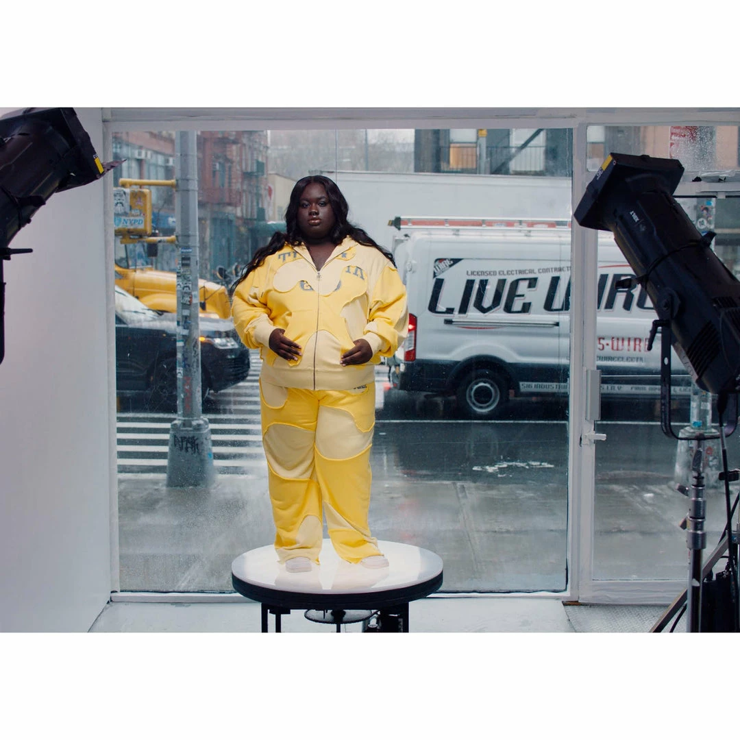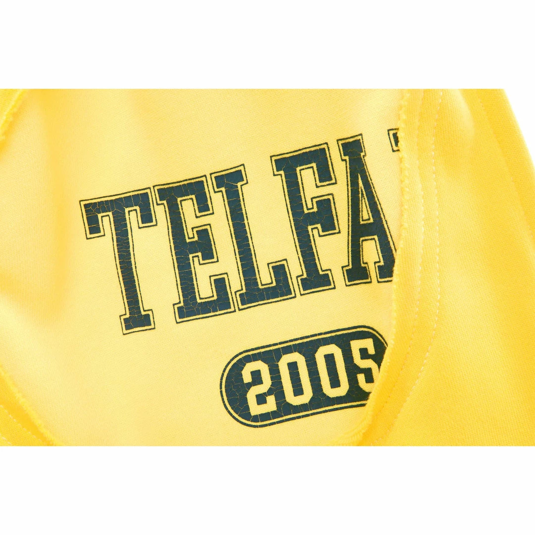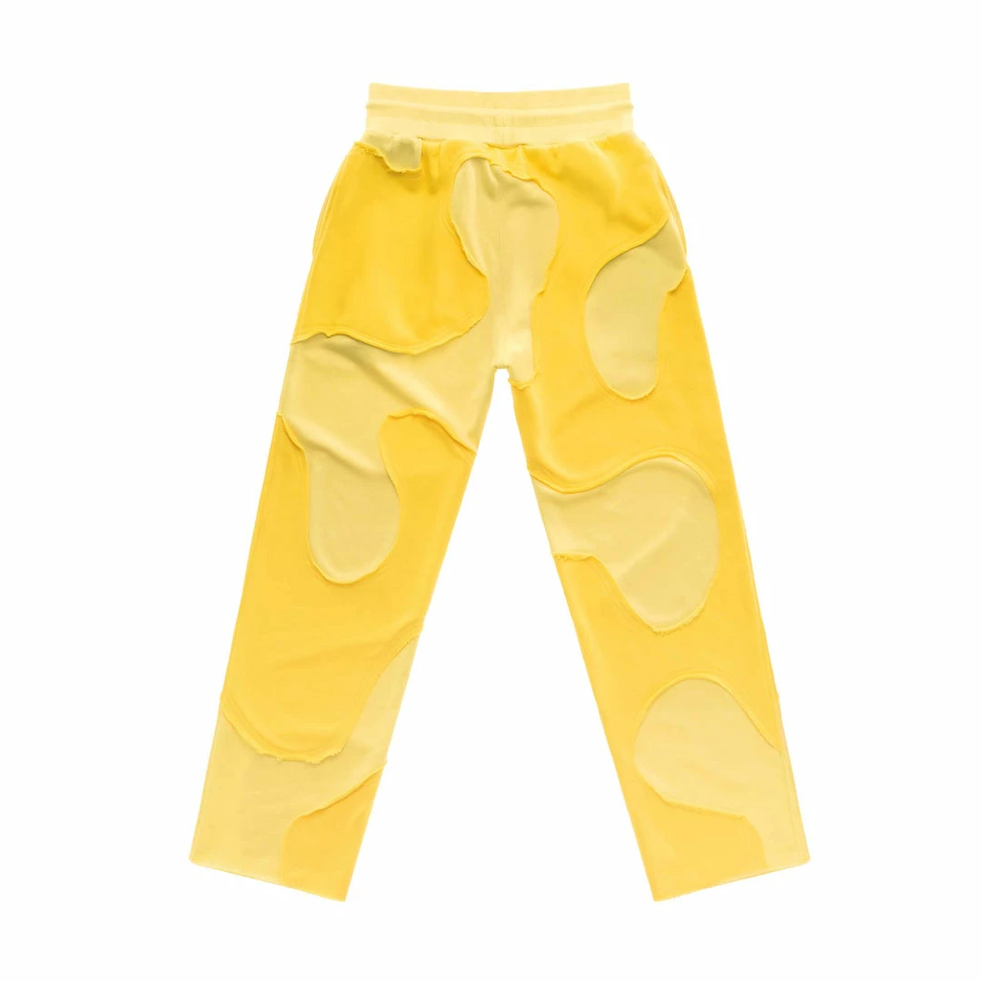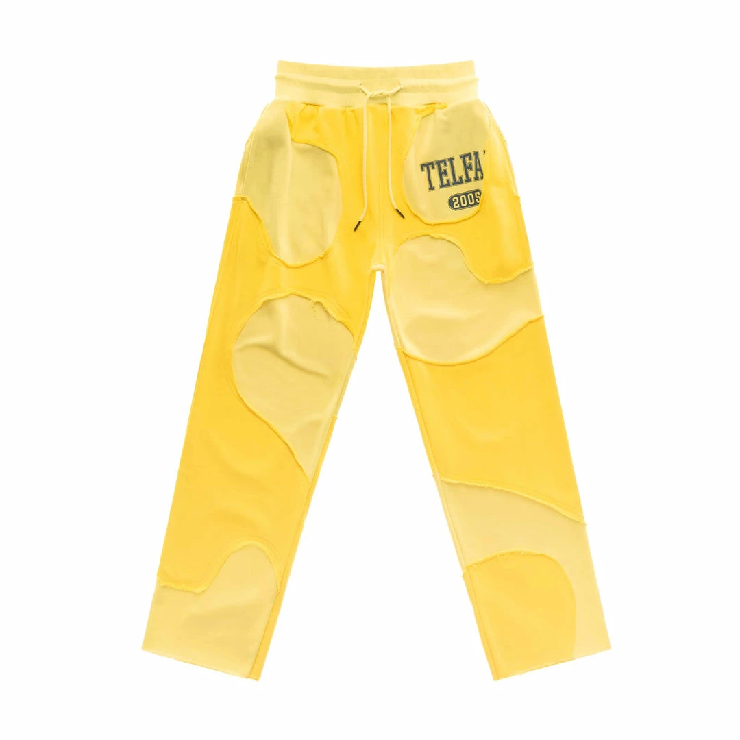 Camo-sweatpant constructed by layering two tones of heather sweatshirt fabric in a camouflage pattern. This cut-off sweatpant features a mid-thigh length, elasticated drawstring waistband, our cracked-ink TELFAR print on left thigh — obscured by raw edged camo cut-outs.