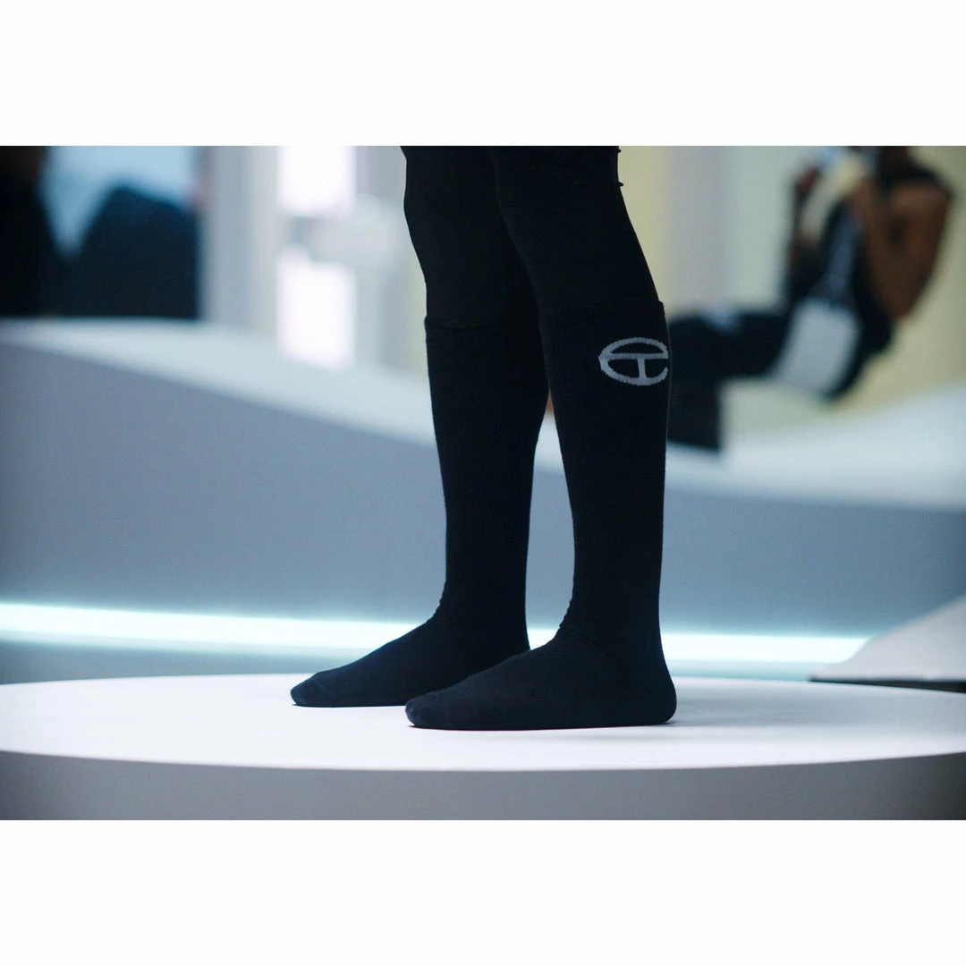 Knee-high stretch knit sock with jacquard Telfar logo.