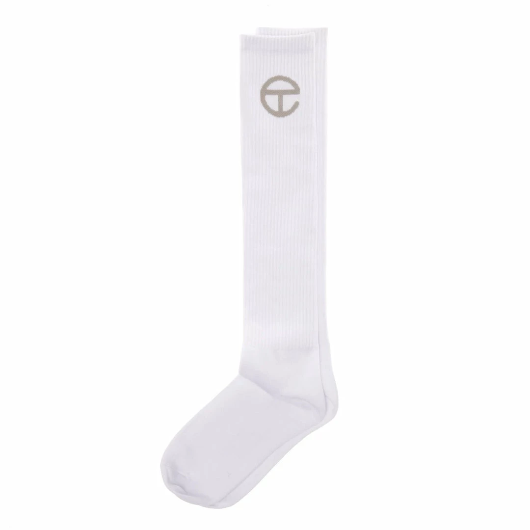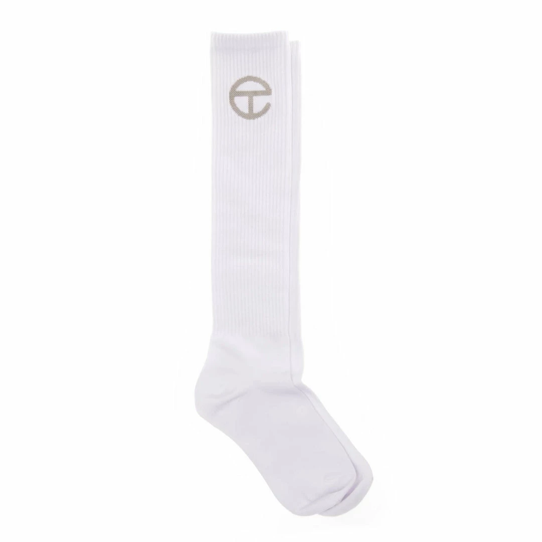 Knee-high stretch knit sock with jacquard Telfar logo.