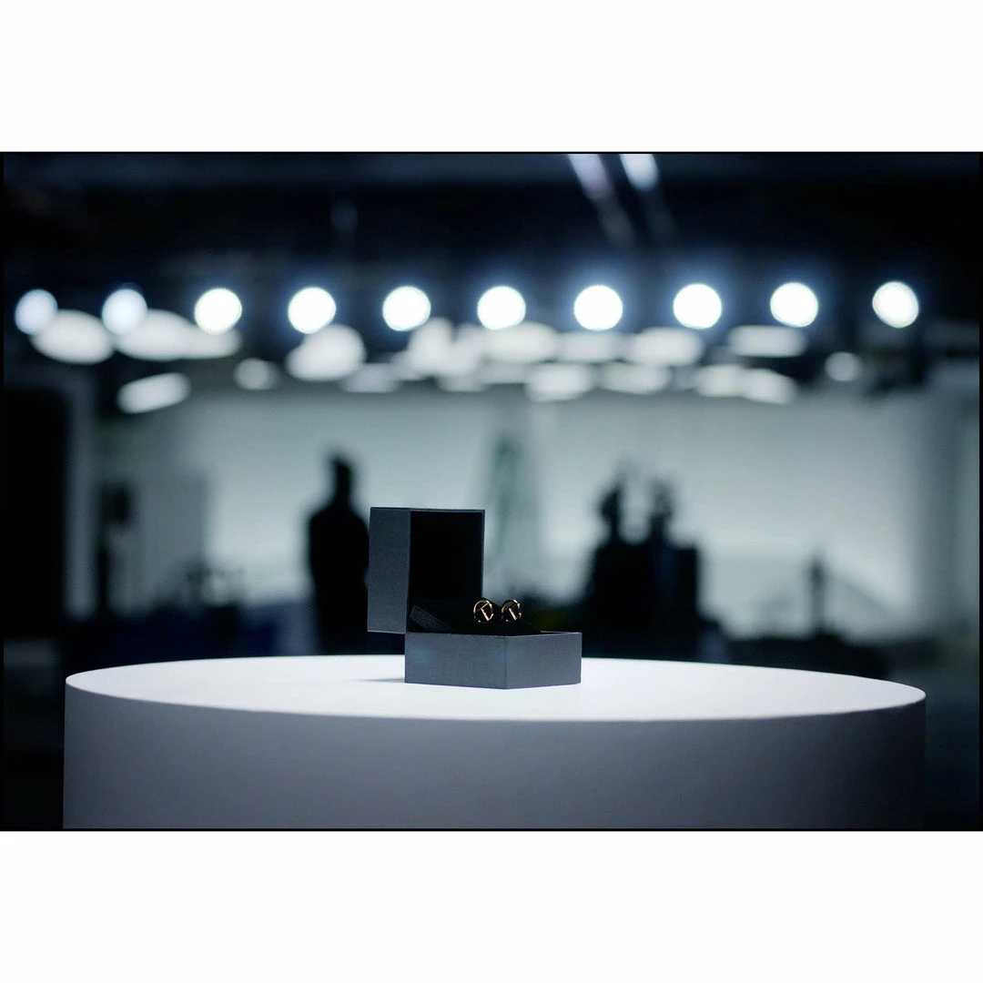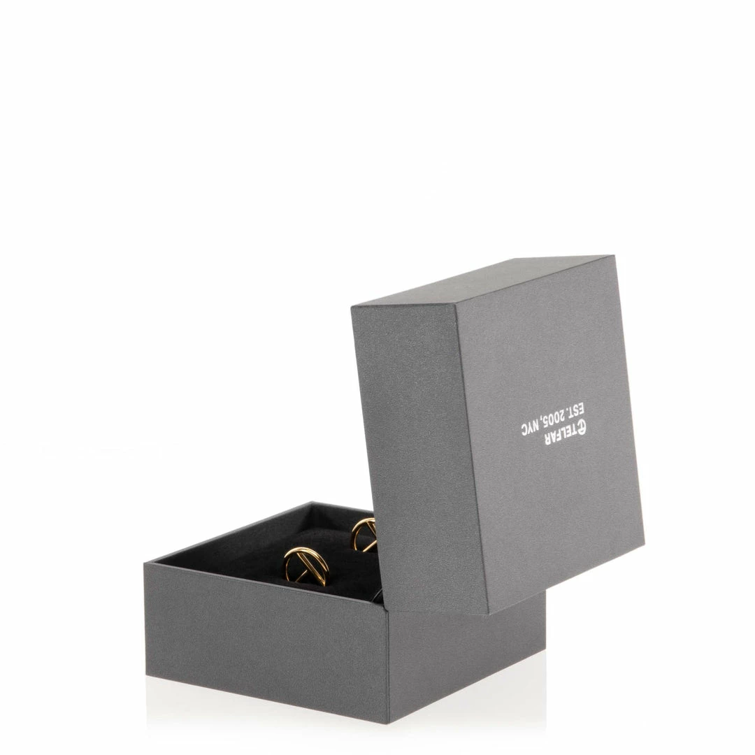 TELFAR logo hoop earring in gold plate. Thick and rugged small size for Unisex-appeal. Sold as a pair. Packaged in custom clamshell box with silver foil insignia.