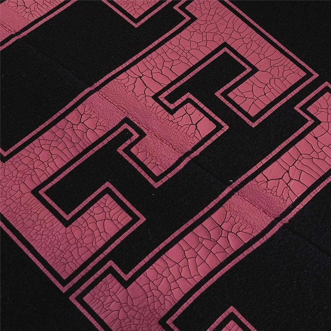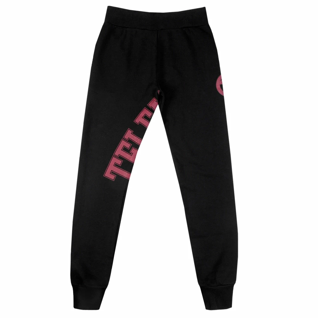 Our iconic collegiate fleece sweatpant, featuring an extra-long leg, extra-heavy black fleece, tall ribbing, elasticated waistband with drawstring ties and our signature “cracked” textured collegiate print.