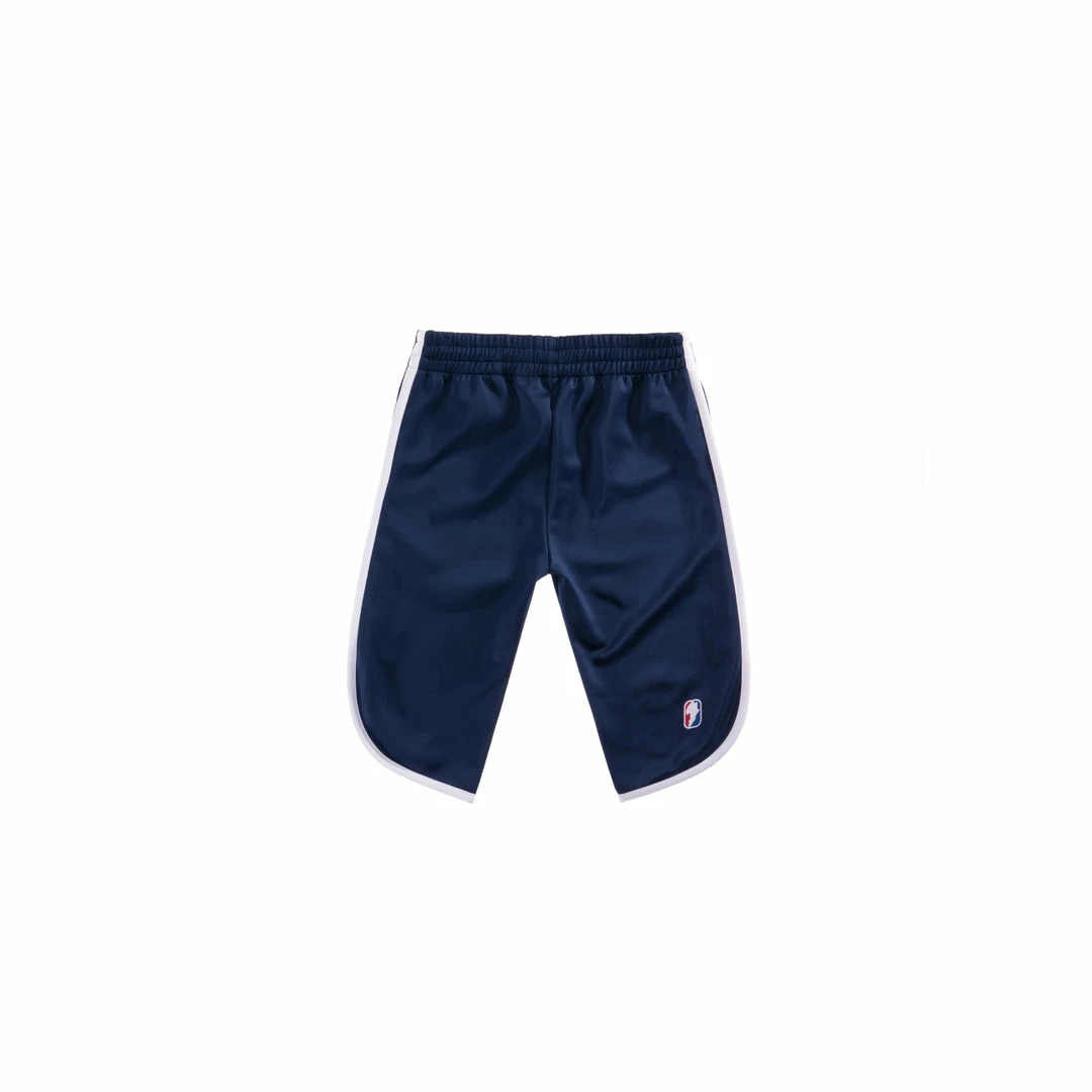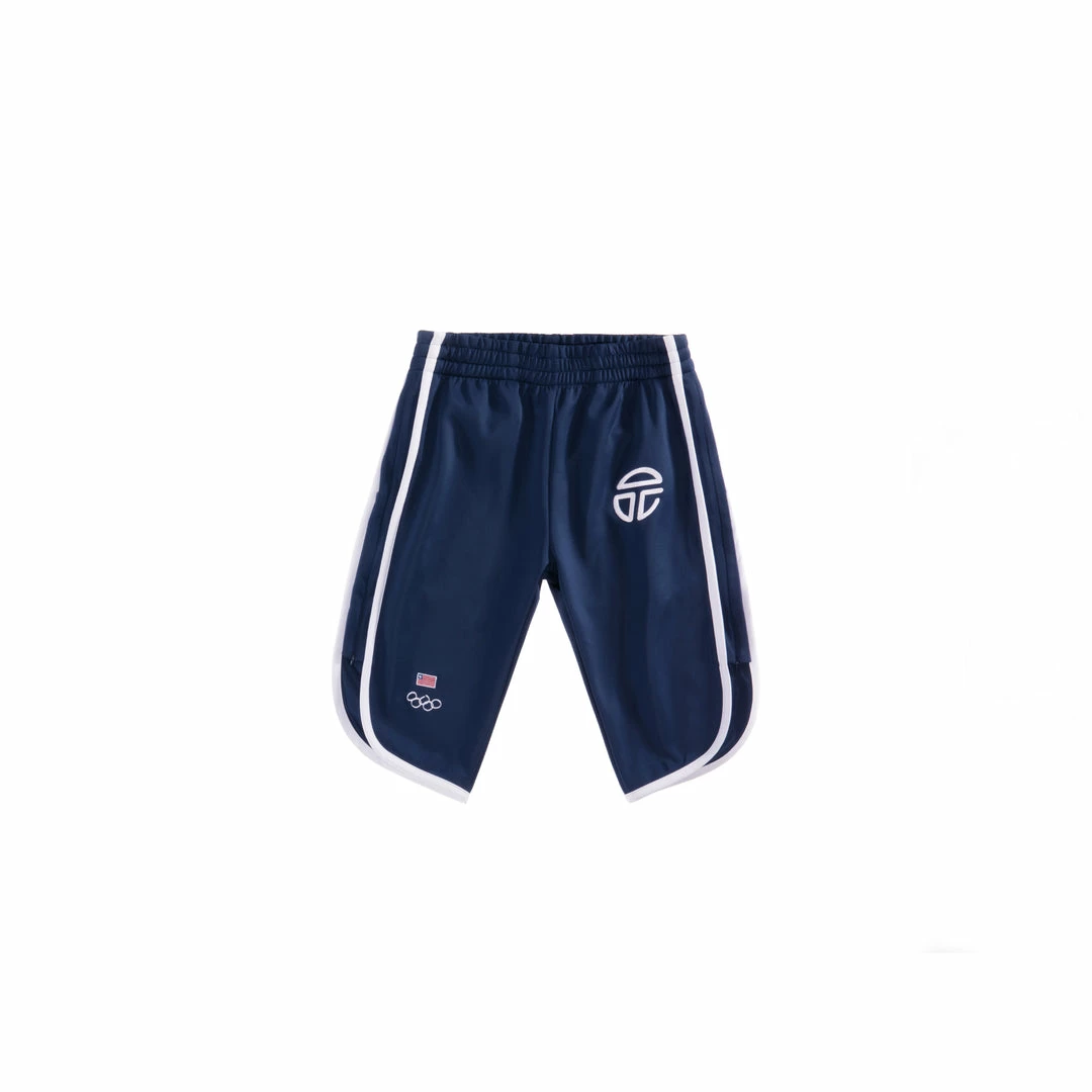 Knee length capri track short with zip pockets hidden in back and front stripes and TELFAR PERFORMANCE and AFRICA embroidery.