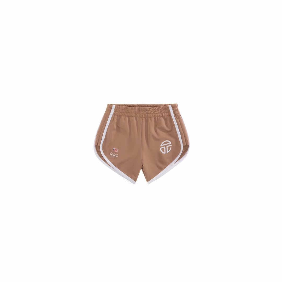 Classic running short with zip pockets hidden in back and front stripes and TELFAR PERFORMANCE and AFRICA embroidery.