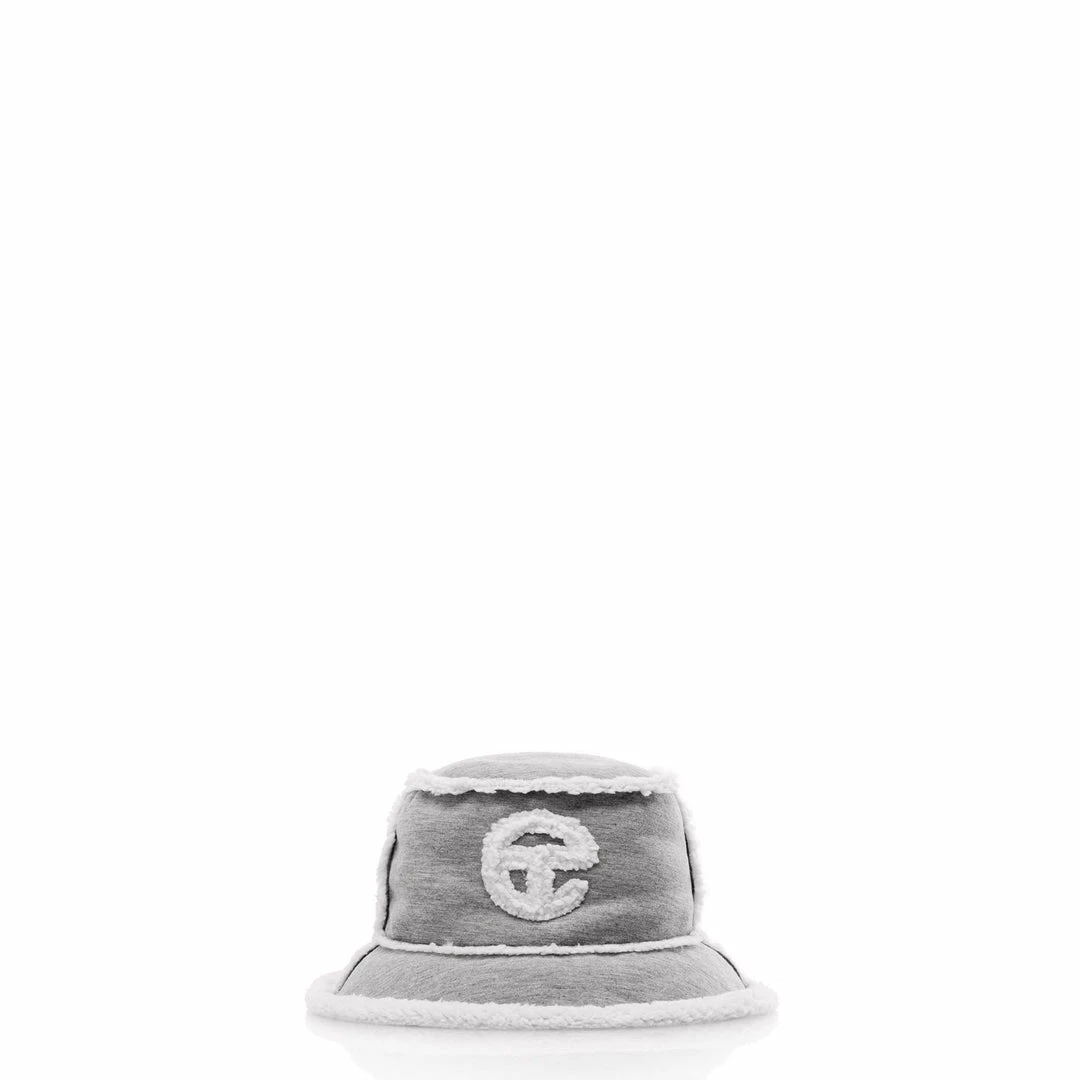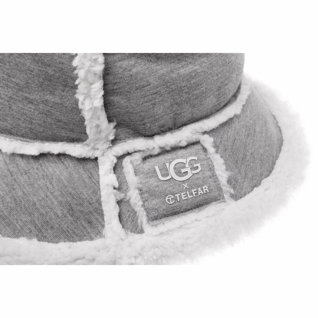 UGG x TELFAR bucket hat in heather grey fleece and shearling for a cozy feel inside and out. Featuring the TELFAR logo in shearling appliqué and collaboration tag on the side brim.
