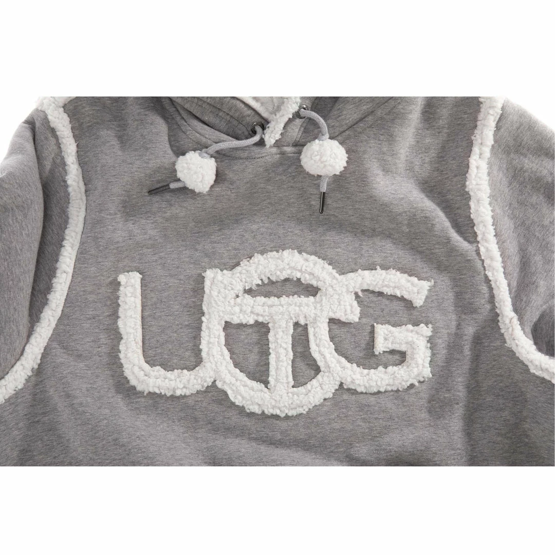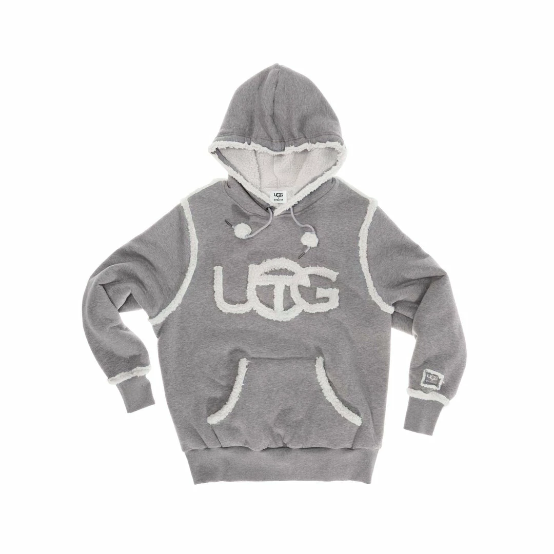 UGG x TELFAR heather grey pullover hoodie, featuring exclusive mash-up logo in sherpa applique, sherpa-lined kangaroo pocket and hood, exposed sherpa-seams and pom-pom drawstrings.