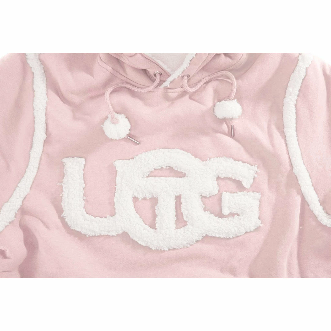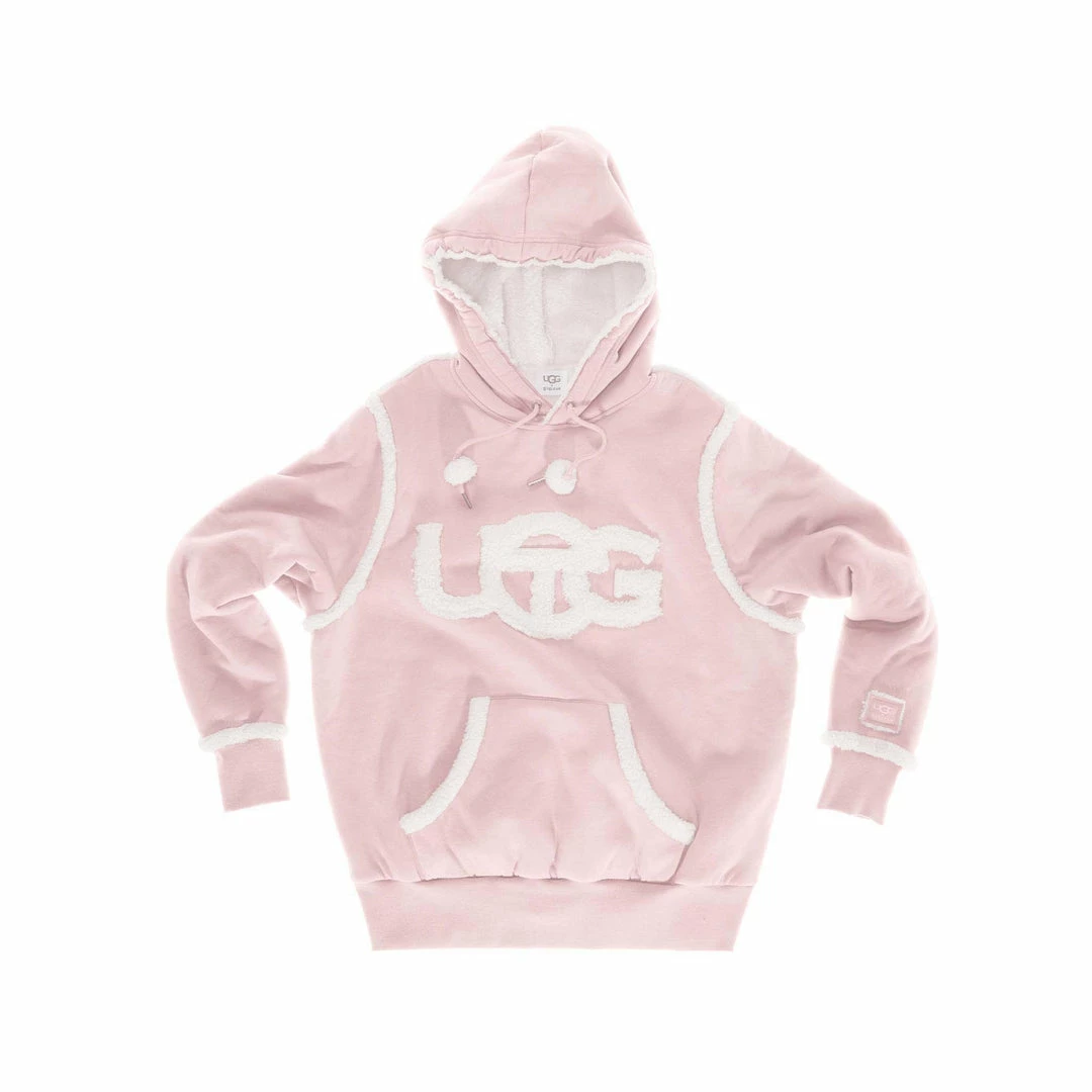 UGG x TELFAR pullover hoodie, featuring exclusive mash-up logo in sherpa applique, sherpa-lined kangaroo pocket and hood, exposed sherpa-seams and pom-pom drawstrings.