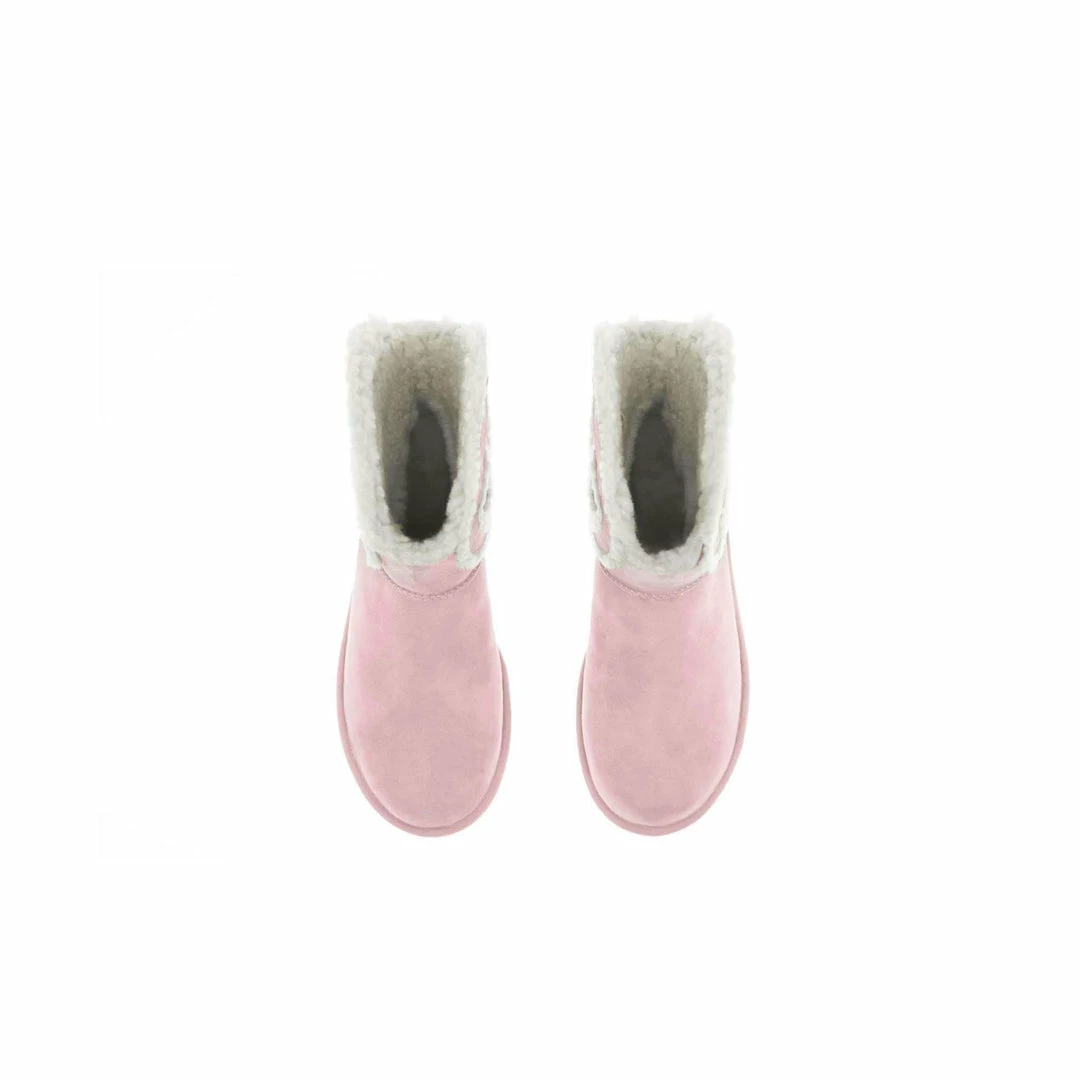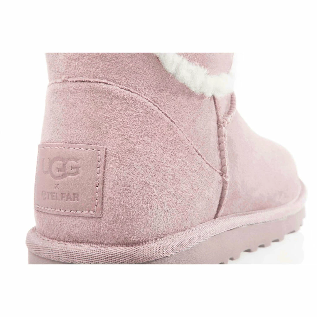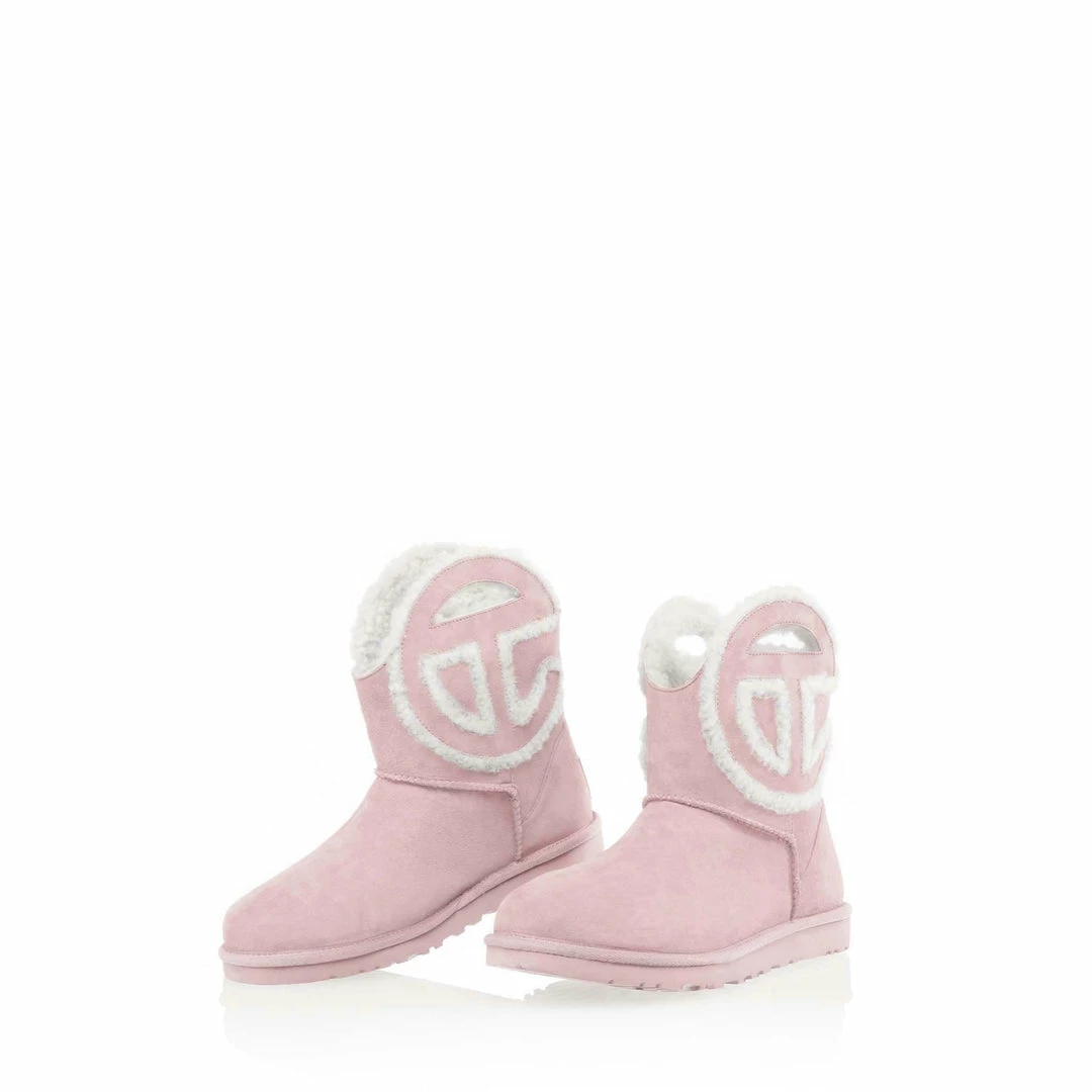 Telfar’s take on the coziest shoe on earth: the iconic UGG mini. Genuine suede on the outside and 100% wool sherpa on the inside, featuring a die cut shearling TELFAR logo bootstrap.